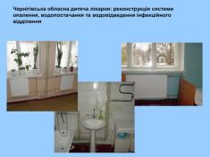 Здійснено реконструкцію системи опалення, водопостачання та водовідведення інфекційного відділення Чернігівської обласної дитячої лікарні; у вересні розпочато заміну технічного обладнання, трубопроводів систем опалення, водопостачання, водовідведення. На сьогодні там освоєно 624 тисячі гривень.