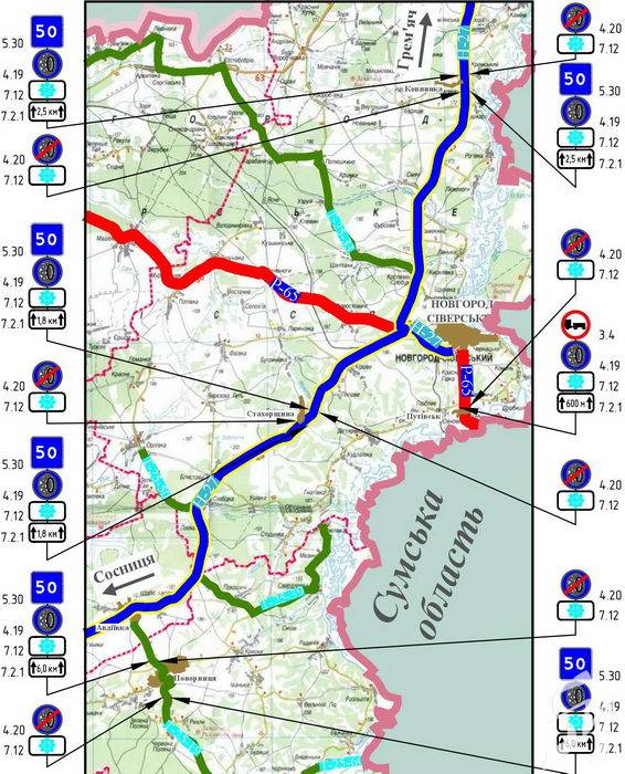 Р-65 КПП “Миколаївка” – Семенівка – Новгород-Сіверський – Глухів – КПП “Катеринівка”, ділянка км 77+670 – км 78+250 (с. Путівськ) – рух вантажних автомобілів з причепами та напівпричепами заборонений, рух із застосуванням ланцюгів протиковзання для вантажних автомобілів;