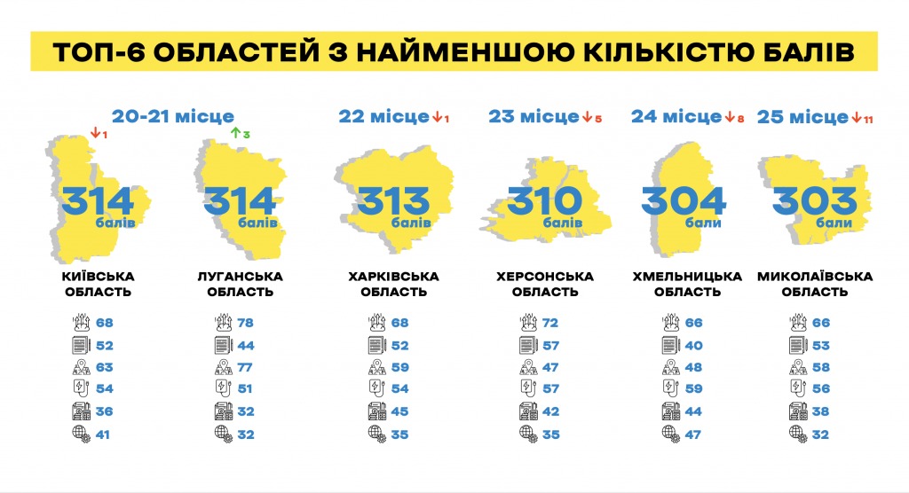 Останні сходинки у рейтингу 2020 року обійняли Київська область (досліджувалась окремо від столиці), Луганська область (дослідження за містом Сєвєродонецьк), Харківщина, Херсонщина, Хмельниччина та Миколаївщина.