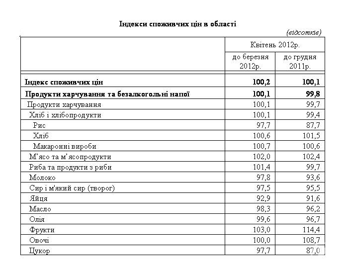 На споживчому ринку області в квітні 2012р.серед продуктів харчування найбільше (на 3,0%) подорожчали фрукти. На 1,4–2,0% підвищилися ціни на рибу та продукти з риби, маргарин, м’ясо та м’ясопродукти; на 0,3–0,7% – на безалкогольні напої, хліб та макаронні вироби.