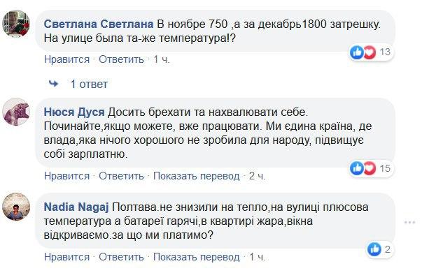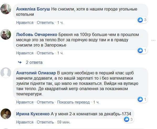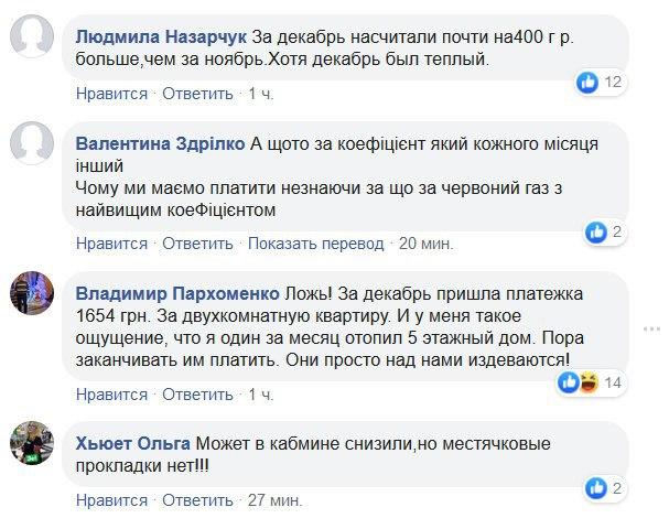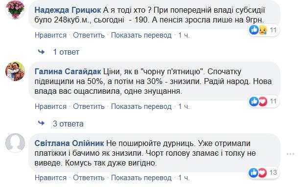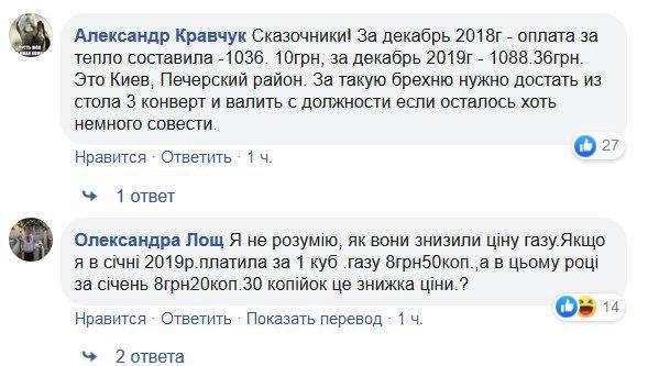 "А чому мовчать, що тепер підвищили так званий коефіцієнт за "доведення до стандартизації" газових лічильників?", "Казкарі! За грудень 2018 року - оплата за тепло склала - 1036, 10 гривень за грудень 2019 року - 1088,36 грн. Це Київ, Печерський район. За таку брехню потрібно дістати зі столу 3 конверт і валити з посади якщо залишилося хоч трохи совісті", "А я тоді хто? За попередньої влади субсидії було 248 куб.м., сьогодні - 190. А пенсія зросла лише на 9 гривень", - пишуть вони.