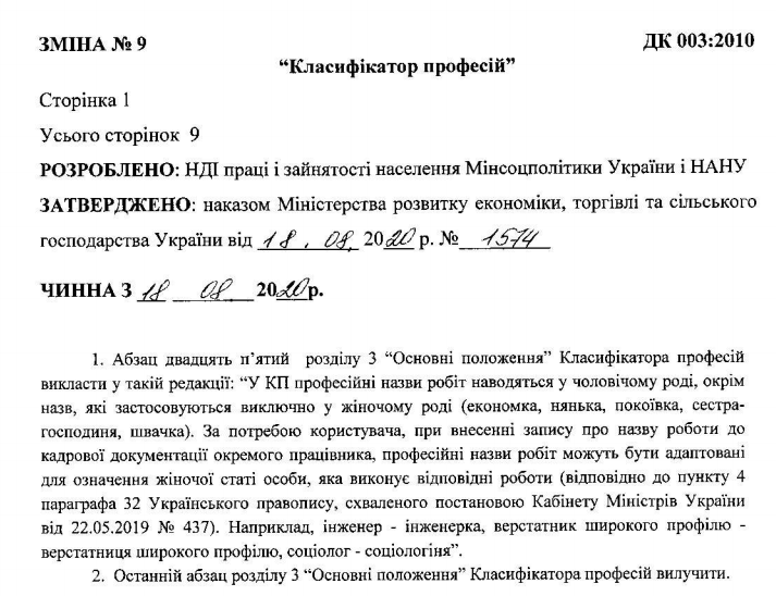 Міністерство розвитку економіки, торгівлі та сільського господарства України дозволило у кадрових документах вказувати професії у фемінітиві.
