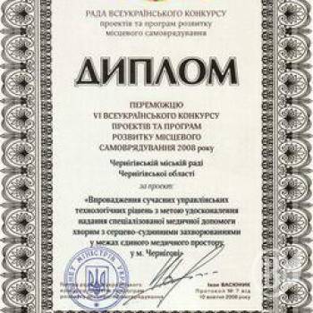 Диплом переможця конкурсу Чернігівська міська рада здобула за проект міського управління охорони здоров'я "Впровадження сучасних управлінських технологічних рішень з метою удосконалення надання спеціалізованої медичної допомоги хворим з серцево-судинними захворюваннями у межах єдиного медичного простору у м. Чернігові".
