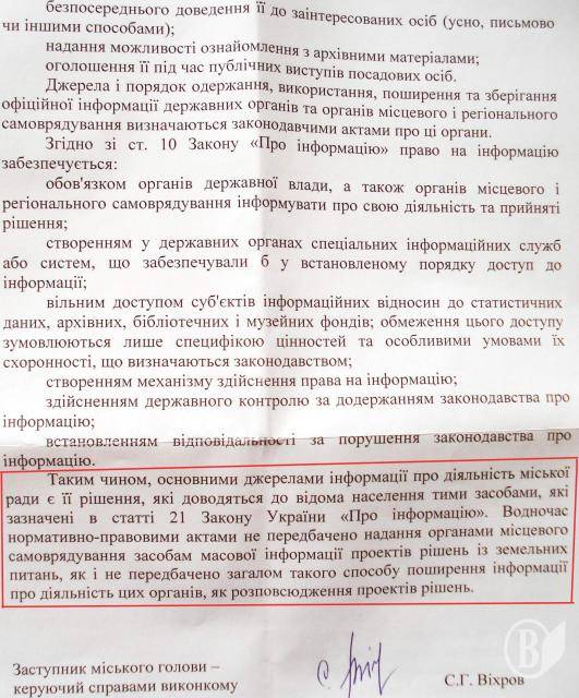В офіційній відповіді, яку отримав Чернігівський освітній центр «Ініціатива», міська влада так пояснює свою позицію: «…нормативно-правовими актами не передбачено надання органами місцевого самоврядування засобам масової інформації проектів рішень із земельних питань, як і не передбачено загалом такого способу поширення інформації про діяльність цих органів, як розповсюдження проектів рішень.»