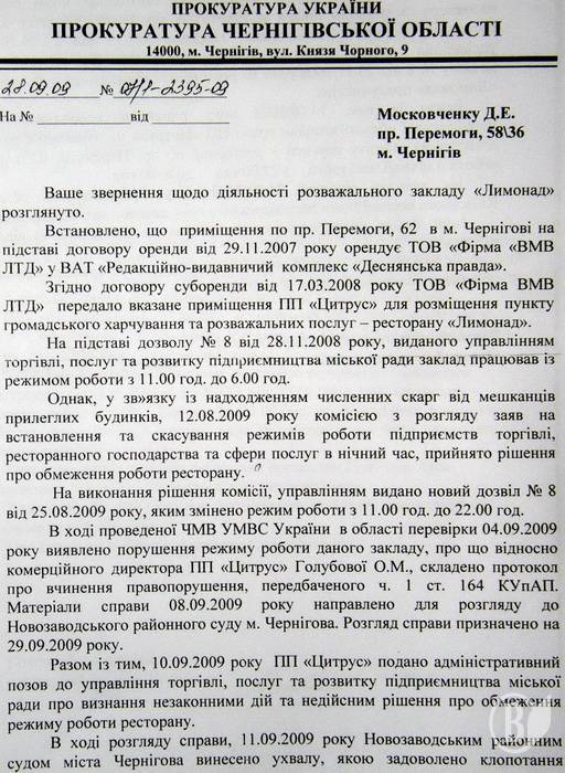 - 12 серпня 2009-го рок у відбулося засідання комісії, яке заборонило нічну діяльність клубу - «Враховуючи рішення комісії Чернігівської міської ради з розгляду заяв на встановлення та скасування режимів роботи підприємств торгівлі та сфери послуг у нічний час, ПП «Цитрус» припинено діяльність у нічний час. Перший заступник прокурора м. Чернігова Кузьменко О.» - І що ви думаєте? «Лимонад» продовжив свою діяльність ніби нічого й не сталося.