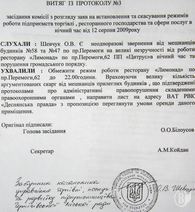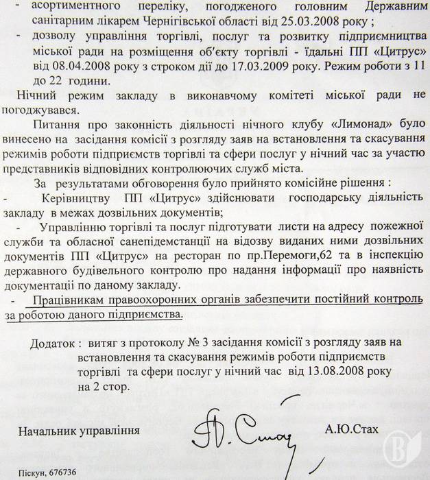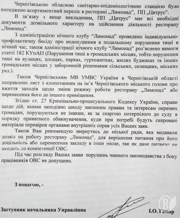 «У ході проведеної міським відділом міліції перевірки 4.09.09 виявлено порушення режиму роботи даного закладу, про що відносно комерційного директора ПП «Цитрус» Голубової О.М. складено відповідний протокол…