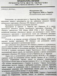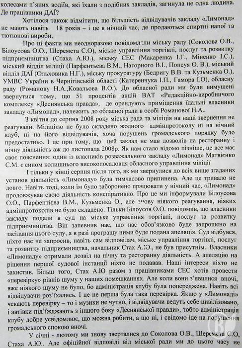 «Просимо вас провести ретельну перевірку бездіяльності органів міської влади й міліції по цьому питанню та вжити вичерпних заходів прокурорського реагування» - пишуть ображені чернігівці прокурору Чернігівської області С.Мірошниченку.