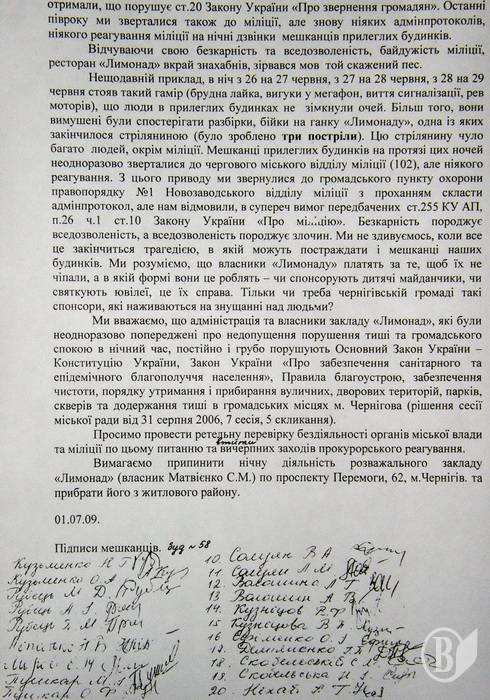 «Наше життя перетворилося на суцільний жах, - пишуть прокурору Чернігівської області С.Мірошниченку мешканці вказаних будинків. – У нас відняли право на відпочинок, гарантований нам Конституцією. Ми перестали спати вночі, ми вимушені спостерігати за розборками, бійками та іншими проявами антисоціальної поведінки: слухати із 24.00 до 6-ї ранку галас відвідувачів, гупання музики, від якої дрижать стіни, брудні лайки, виття сигналізації, гудки авто.