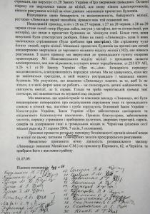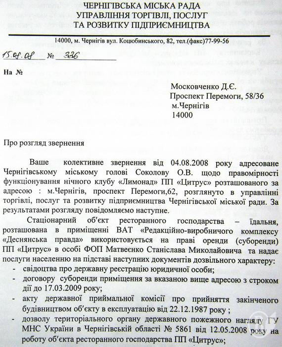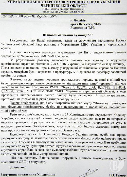 «У січні-лютому цього року ми неодноразово зверталися до Чернігівського міського голови Олександра Соколова, але офіційної відповіді не отримали ще й досі. Бездіяльність міської ради порушує ст.20 Закону України «Про звернення громадян». Останні півроку ми зверталися також до міліції, але знову ніяких адмінпротоколів, ніякого реагування на нічні дзвінки мешканців прилеглих будинків».