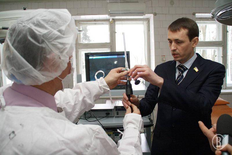 - Сегодня для Черниговской областной больницы действительно знаменательный день, потому, что о таком оборудовании, как то, которое поступило в ваше урологическое отделение, большинство больниц Украины может только мечтать. Перед визитом в областную больницу я посмотрел перечень медицинского оборудования, которое благодаря помощи Валерия Дубиля было передано лечебным заведениям Чернигова и области. Перечень поставленного в область оборудования – это самое нужное, то, что давно должно быть в медучреждениях, но его по разным причинам не было. В частности, презентуемый сегодня контактный литотриптор работает по принципу отбойного молотка. Прибор применяется для удаления под эндоскопическим контролем камней из мочевого тракта, почек, мочеточника и мочевого пузыря путем передачи начальной баллистической энергии за счет прямого механического воздействия непосредственно на камень, приводя к его полному разрушению. При данном способе отсутствует риск повреждения внутренних тканей, не излучается тепловая или иная энергия, нет необходимости использовать специальное оборудование для локализации камней.