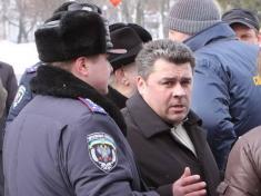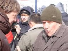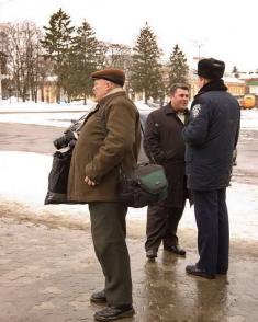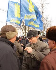 Однак спокійно почати мітинг їм не дали – поруч розташувалися десятка з два молодих людей під стягами Всеукраїнського об’єднання «Свобода». Між двома таборами, як і належить у таких випадках, вишикувалась міліція і «бійці невидимого фронту» з СБУ.