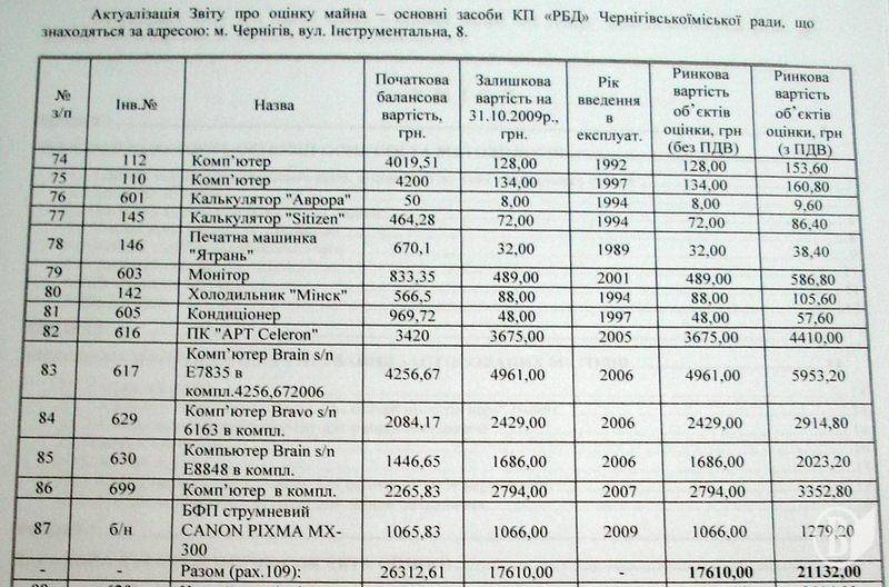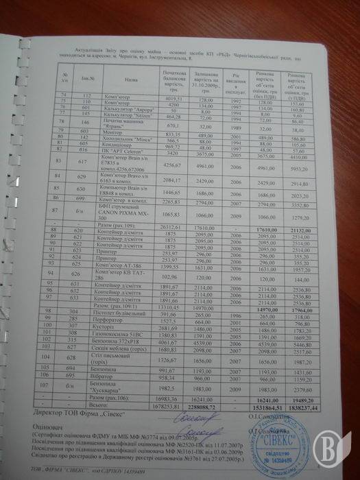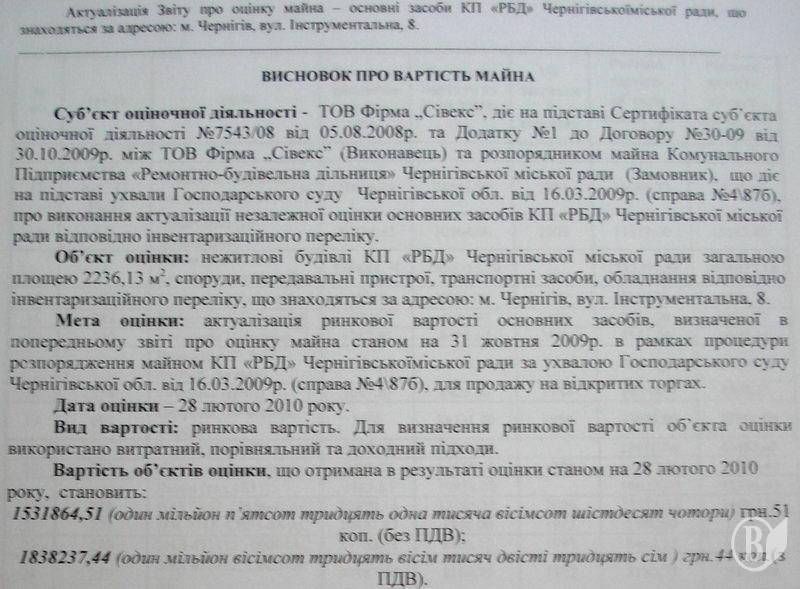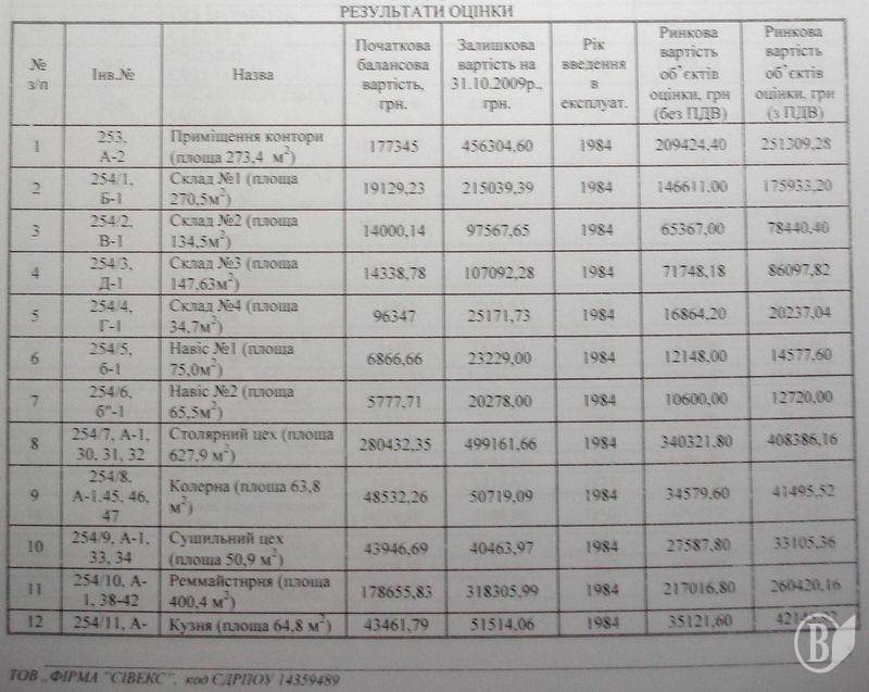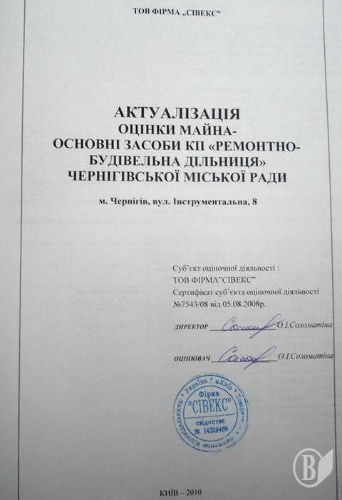 Залучена інвестором фірма-оцінювач «Сівекс» оцінила всю вартість комунального майна в цілих 1838237,44 грн. (один мільйон вісімсот тридцять вісім тисяч двісті тридцять сім гривень 44 копійки). Не дивлячись на те, що тільки балансова вартість цього майна на жовтень 2009 року була на 450 тисяч гривень більшою!