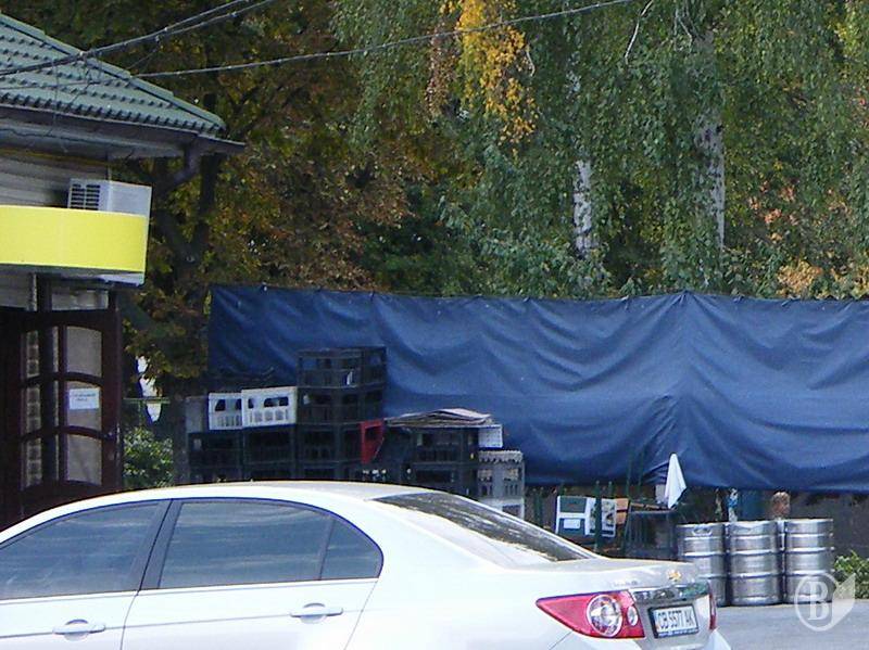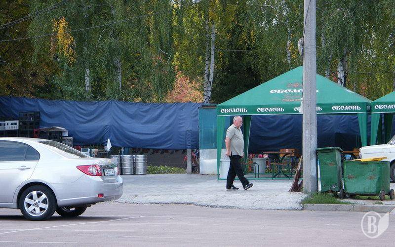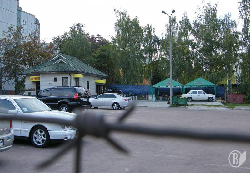 Стоянка автомобилей за пару сотен метров от бывшей школы №8. За теми пивными палатками и горой ящиков и кегов - территория детсада.