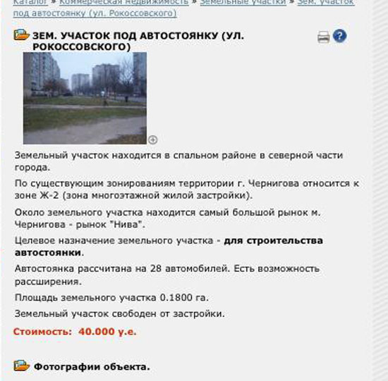 Один із чернігівських сайтів оголошень днями розмістив повідомлення про продаж за 40 тисяч доларів земельної ділянки в районі "Хитрого ринку".