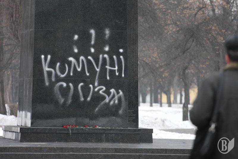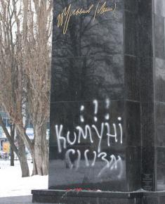 Ніч з лютого на березень принесла пам’ятнику Володимиру Ульянову (Леніну) нові неприємності. Його обписали вдруге після реставрації.