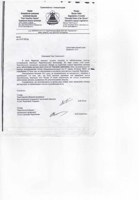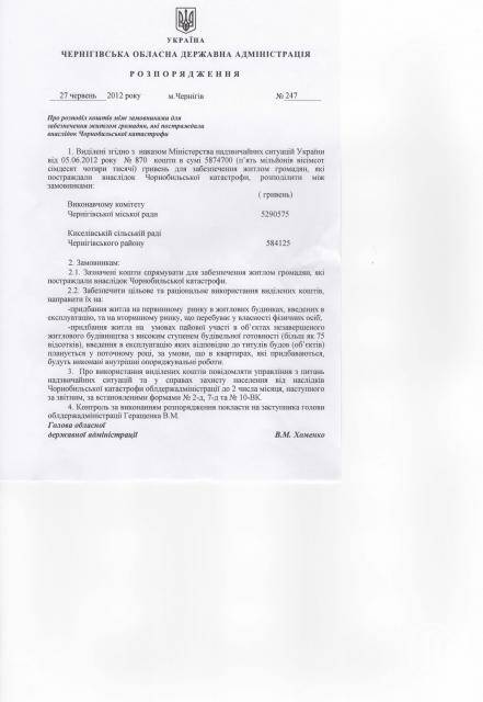 Як нам розповів голова обласного відділення допомоги інвалідам Чорнобиля Євген Сонник, 27 червня голова Чернігівської обласної державної адміністрації видав розпорядження, яким було передбачено спрямувати 5,3 млн гривень на місто Чернігів для закупівлі житла чорнобильцям. Решту ж грошей було спрямовано на Киселівську сільську раду. 16 липня на нараді у заступника голови ОДА Віктора Геращенка було озвучено ідею перерозподілити кошти на райони. Мовляв, у Чернігові неможливо закупити квартири за ціною, яку встановив Мінрегіонбуд.