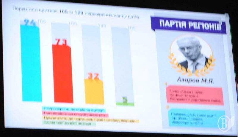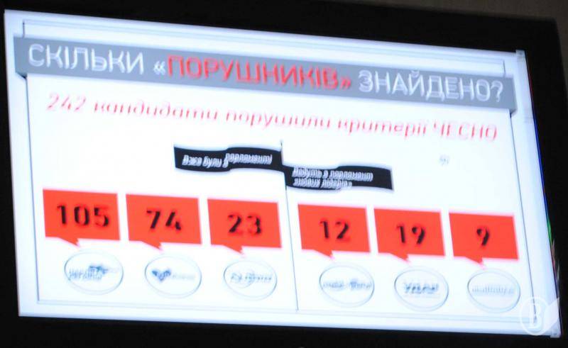 За їх словами аналізували списки 73 аналітики, 10 юристів та 26 регіональних представників. Щодо самих списків, то нечесних кандидатів, що порушили хоча б один критерій, то вони є у всіх партіях. Але є навіть «тенденції порушень». Коли у партії найбільше порушників одного критерію. У Партії регіонів, наприклад, 94 кандидати мають «непрозорість витрат», тобто живуть не у відповідності з задекларованими у податковій доходами.