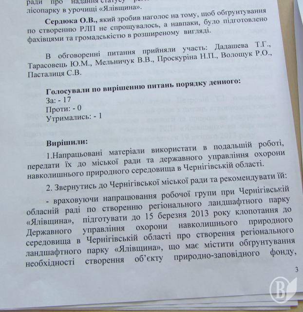 Громадські активісти приготували документи для РЛП «Ялівщина». Міськрада мала їх подати за процедурою (до 15 березня) Чернігівському управлінню охорони навколишнього природного середовища, а управління – до обласної ради. Порядок такий.