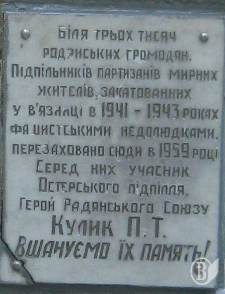 Однак у вище вказаному Переліку, до речі, саме на вимогу депутатів-комуністів цієї райради не було включено саме групу братських могил з рештками близько 3000 підпільників, партизан та мирних жителів на старому Руському кладовищі. Серед них – П.Т. Кулик – герой СРСР, учасник Остерського підпілля. При цьому прізвище цього героя совєтсько-фінської війни вказано першим на пам’ятнику, встановленому на честь красноармійців, що загинули при визволенні Чернігова (поховано 280 бійців). Ці поховання розташовані майже поруч із «забутим» похованням.