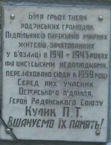 Група братських могил з рештками близько 3000 підпільників, партизан та мирних жителів на старому Руському кладовищі. Серед них – П.Т. Кулик – герой СРСР, учасник Остерського підпілля.