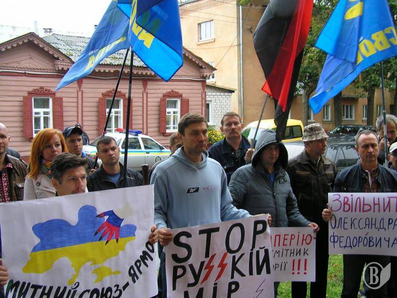 Учасники мітингу тримали плакати з надписами: "Вимагаємо покарати винних у смерті українських рибалок!", "Звільнити Олександра Федоровича!", "Митний союз – ярмо!".