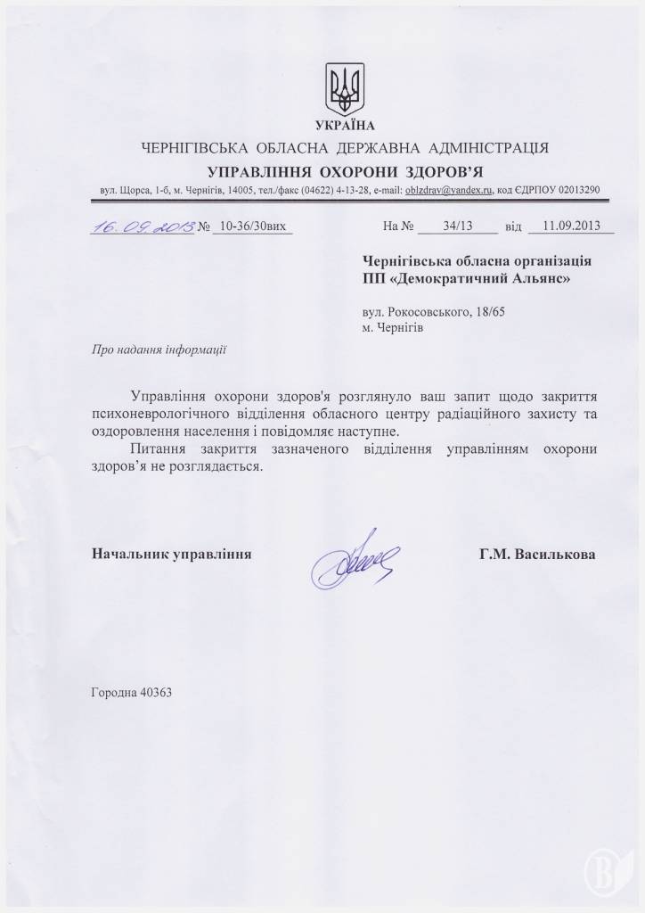Згідно відповіді начальника управління охорони здоров`я Чернігівської ОДА Г.М.Василькової: «…питання закриття зазначеного відділення управлінням охорони здоров`я не розглядається».