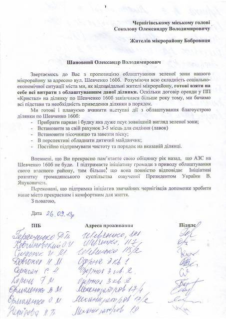 Враховуючи, те що договір оренди у ПП «Кристал» депутата Наталії Осіковської закінчився більше року тому, чернігівці планують нарешті хоч власними силами привести свій зелений майданчик в порядок.
