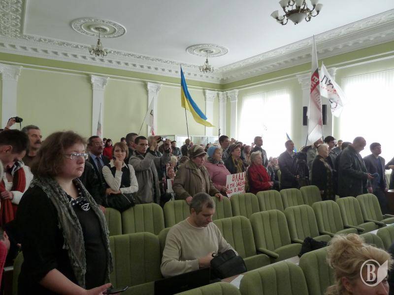 Після того, як поставлена на голосування пропозиція зняти питання знайшла підтримку лише 15-ти депутатів, Олег Ляшко почав брати штурмом сесійну залу, заводячи до неї людей з вулиці з прапорами і гаслами: