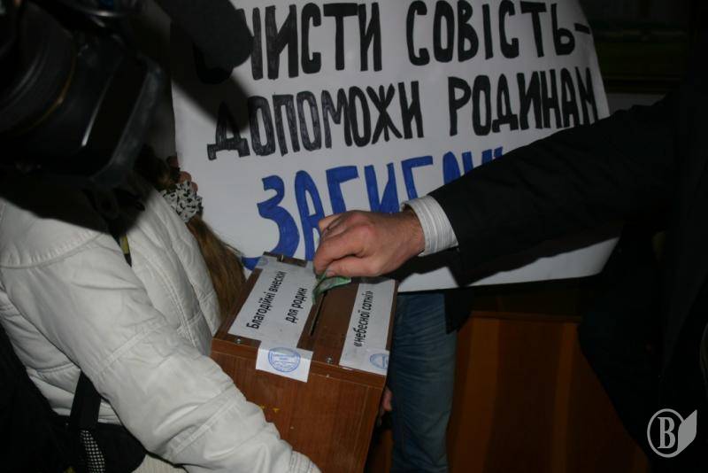 Акція «Очисти совість – допоможи родинам загиблих» по збору коштів на допомогу родинам «Небесної сотні» пройшла серед депутатів перед позачерговою сесією, 24 лютого.