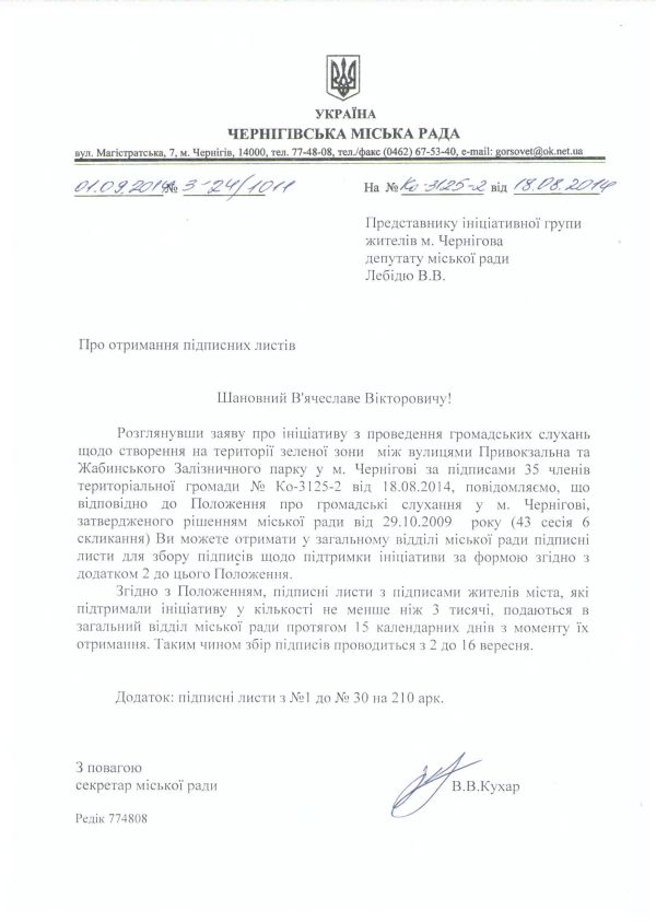Як повідомив депутат міської ради В`ячеслав Лебідь, партія «Батьківщина», це один із найвідповідальніших моментів у всьому процесі, адже, згідно Положення про громадські слухання, на їх проведення та збір трьох тисяч підписів виділяється всього 15 календарних днів (з 2 по 16 вересня). І вкрай важливо, аби якомога більше чернігівців долучились до боротьби за збереження зеленої зони, яка служить екологічним щитом для мешканців будинків, що знаходяться неподалік залізничних колій.