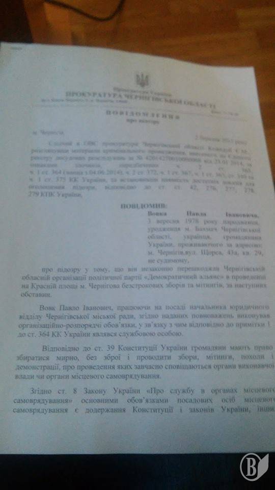 Серед осіб, яким прокуратура області винесла підозру в причетності до розгону чернігівського Євромайдану, голова юридичного відділу Чернігівської міської ради Павло Вовк.