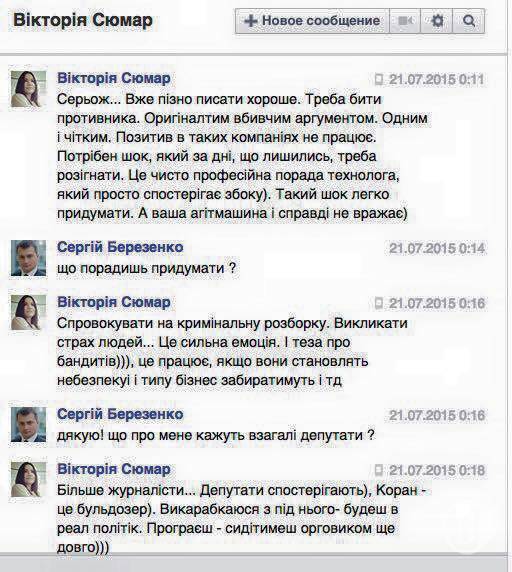 Сюмар для победы Березенко советует «справоцировать криминальную разборку» в Чернигове. Она называет это «сильной эмоцией» и говорит о том, что «нужен шок, который за оставшиеся дни нужно разогнать». И еще советует «добавить тезис про бандитов, которые несут опасность и типа будут бизнес отбирать».
