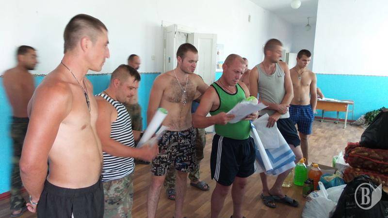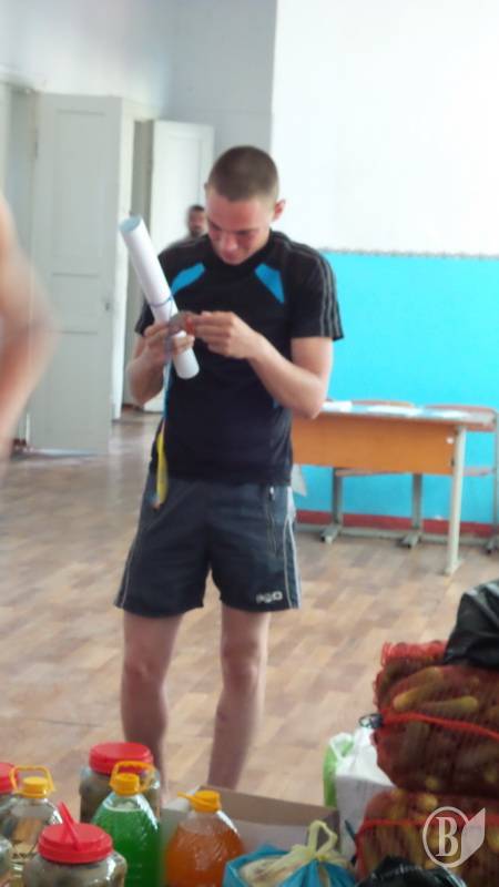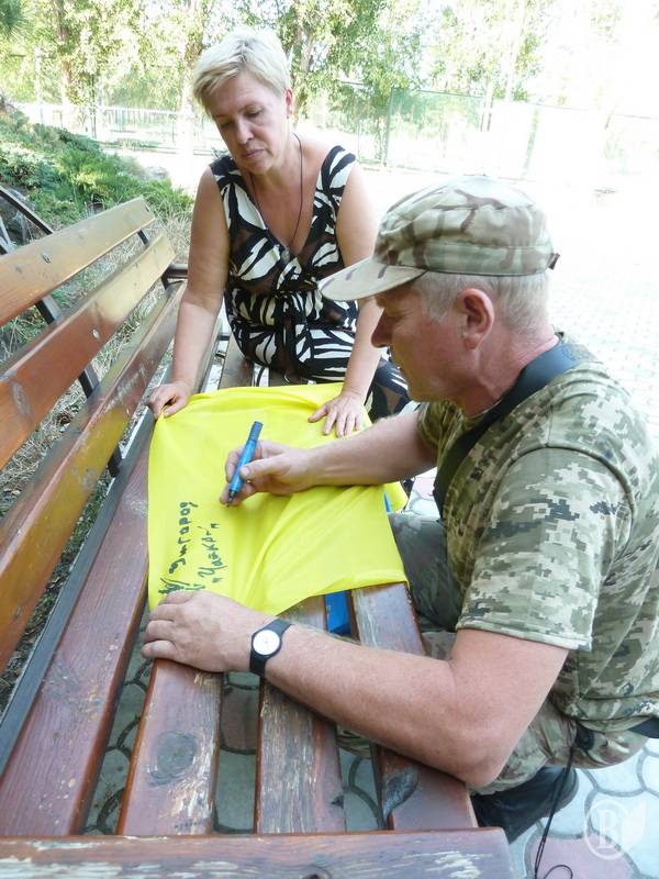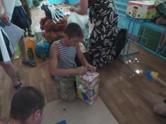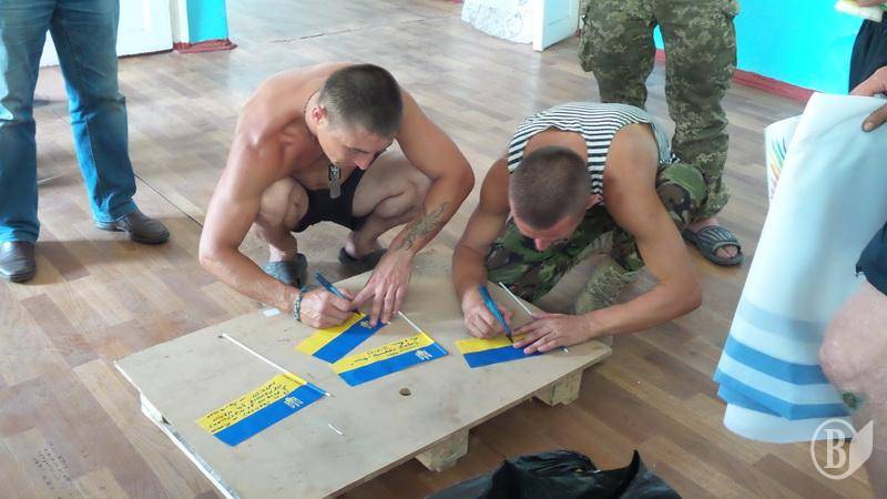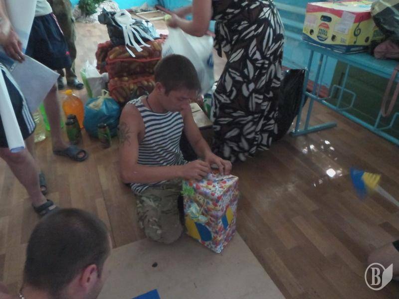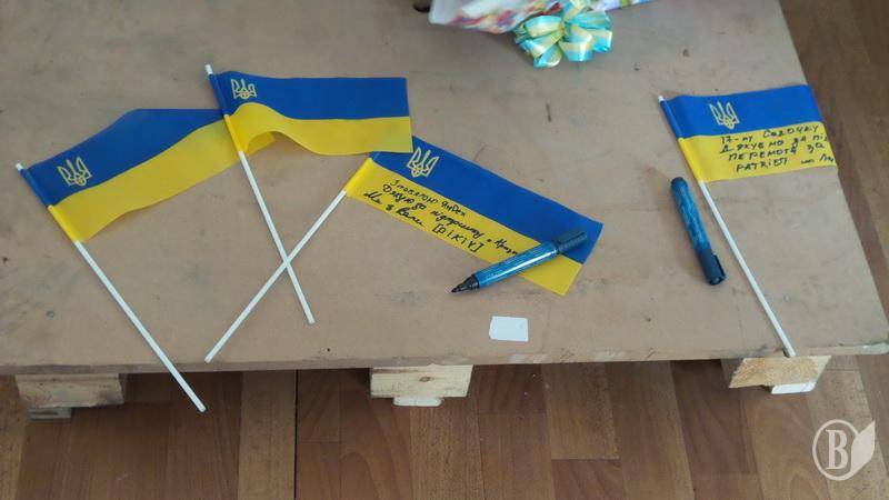 Разом з прапорами бійці отримали безліч дитячих малюнків, деякі необхідні у побуті речі, одяг, взуття, солодощі, ліки й огірки від Ніжинського консервного заводу, які дбайливо разом з волонтерами-журналістами доставив в Сектор М капелан 41-го батальйону отець Сергій Чечин.