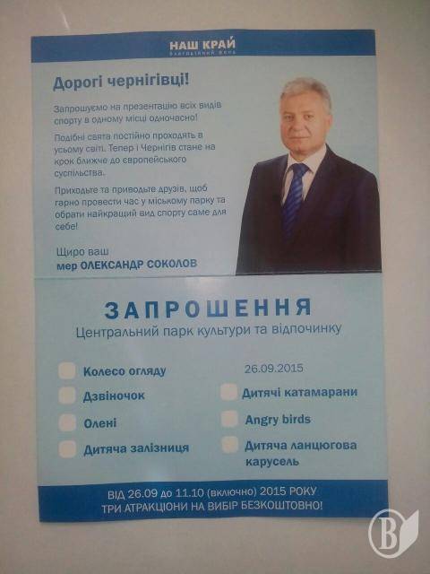 Громадянська мережа ОПОРА вже повідомляла, що претендент на мерське крісло Атрошенко запрошував малят покататися на дитячих атракціонах. А розповсюджена від імені чинного мера, висуванця від політичного об’єднання «НАШ КРАЙ», продукція повторює не тільки зміст, але і дизайн запрошень згаданого опонента.