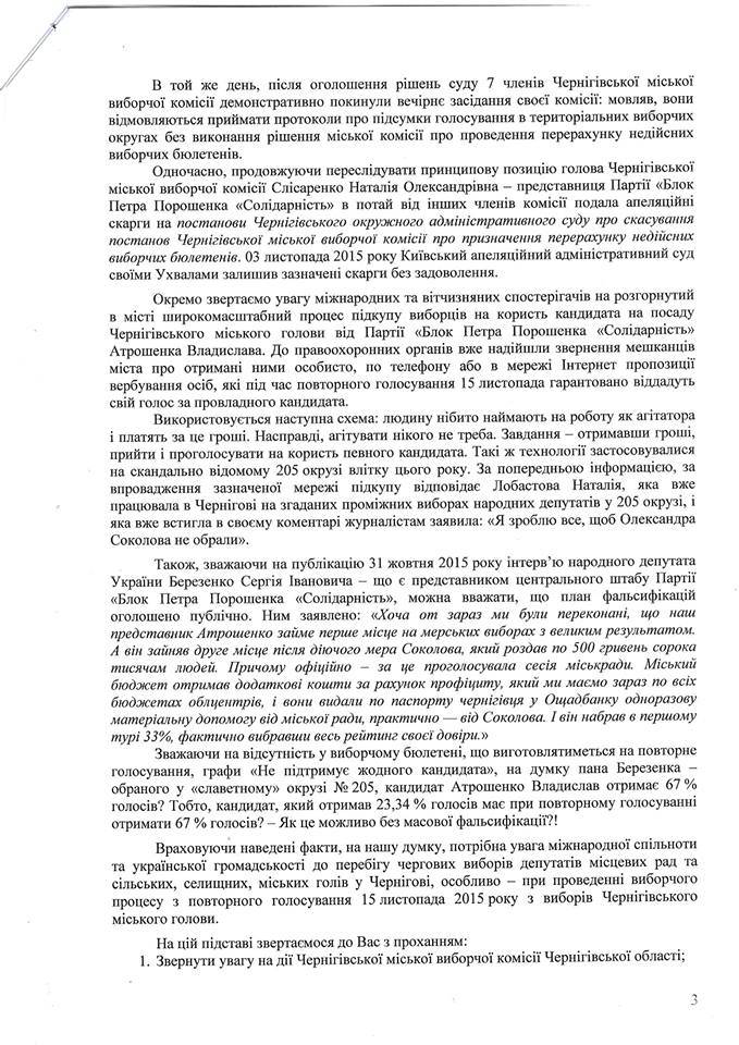 Вони просять звернути увагу на дії виборчої комісії, направити спостерігачів на другий тур виборів чернігівського міського голови та включити до звітів кричущі факти беззаконня.