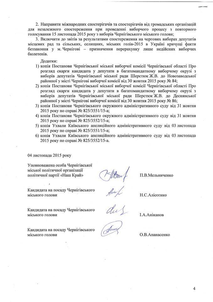Через загрозу зриву виборів та підкупу виборців Чернігівська міська партійна організація політичної партії «Наш Край», кандидати на посаду мера Наталія Алісєєнко , Іван Аніканов, Олександр Апанасенко оприлюднили відкрите звернення до міжнародних та українських спостерігачів, громадських організацій.