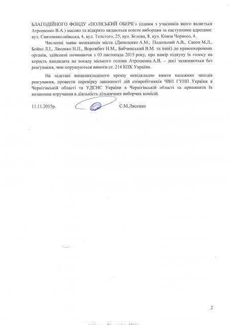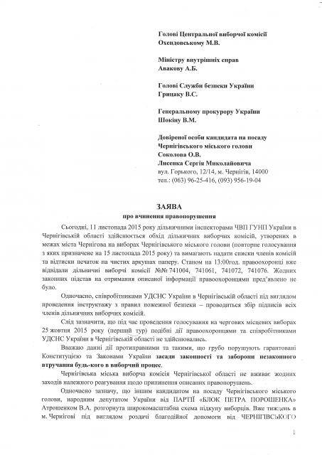 У зв'язку з цим він звернувся до Центрвиборчкому, до міністра МВС України Арсена Авакова, до СБУ, а також до Генпрокуратури з вимогою зупинити беззаконня на виборах у Чернігові. «Прошу негайно вжити заходів і зупинити незаконне втручання в діяльність виборчкомів», - йдеться в заяві.