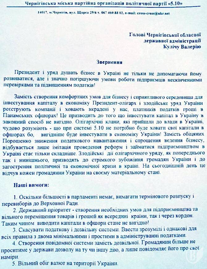 Чернігівська міська партійна організація «5.10» звертається до голови Чернігівської обласної державної адміністрації Валерія Куліча.