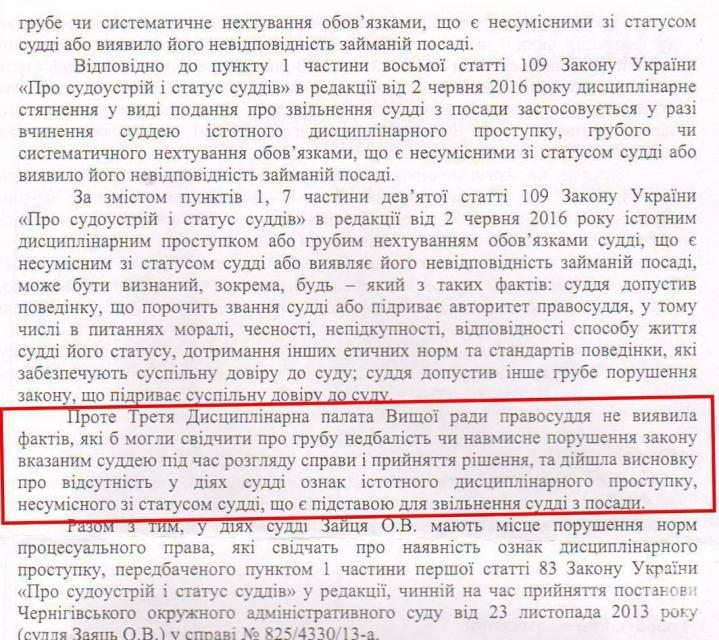 Дисциплінарне стягнення до судді може застосовуватись не пізніше 3-х років з дня вчинення проступку. Після того, як трирічний термін сплив, заяву розглянули. В тексті ухвали вказано, що не виявлено фактів, які б могли вказувати про грубу недбалість чи навмисне порушення закону суддею Зайцем.