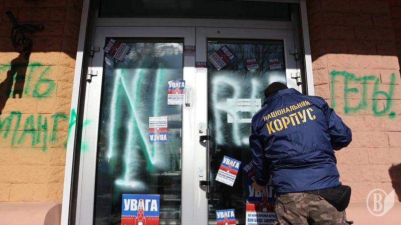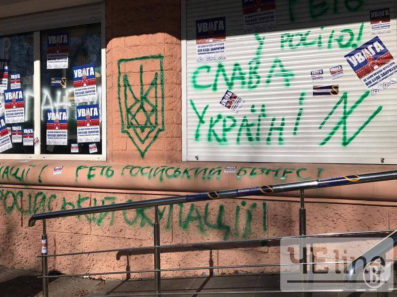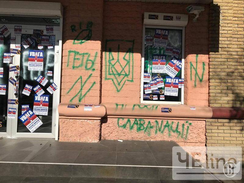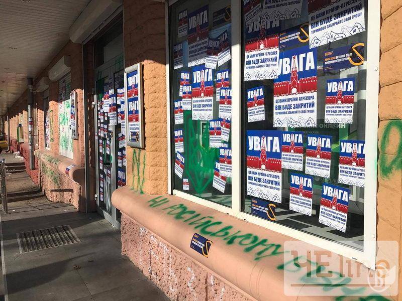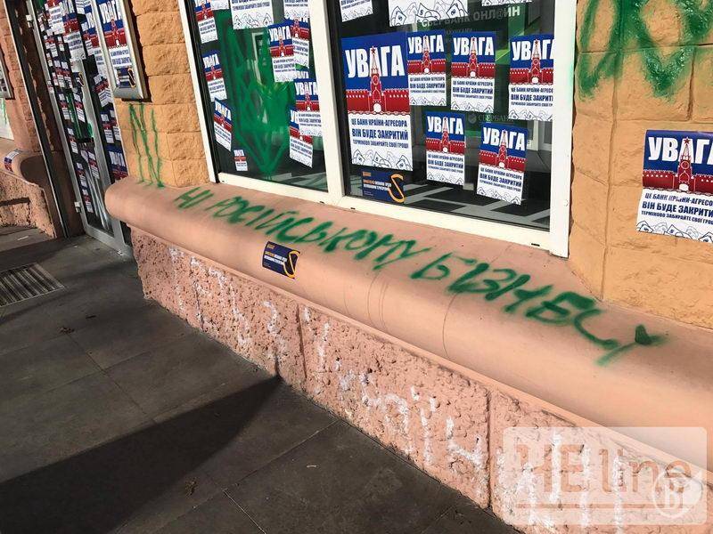 На стінах банку написи «Ні російській окупації» та «Геть російський бізнес». З такими ж гаслами на приміщенні банку були наліпки.