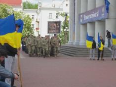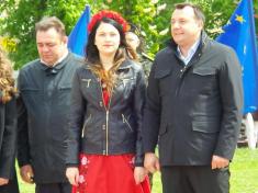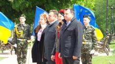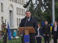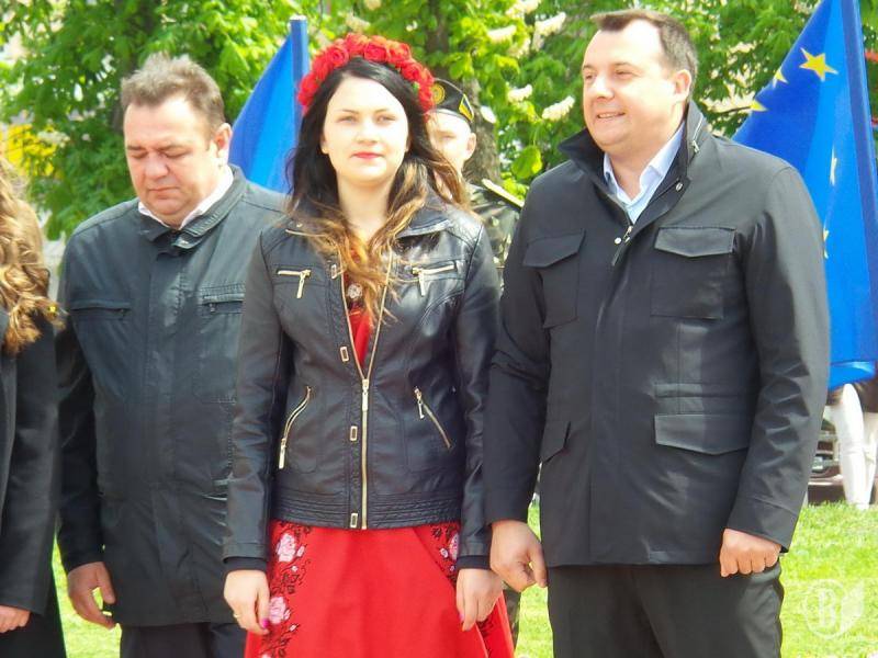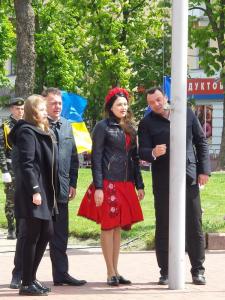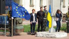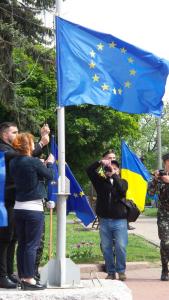 Прозвучали пафосні промови від представників влади. Підняття прапору Європейського союзу, за класикою жанру і радянською традицією, доручили студентці, красуні, спортсменці, однак не комсомолці.