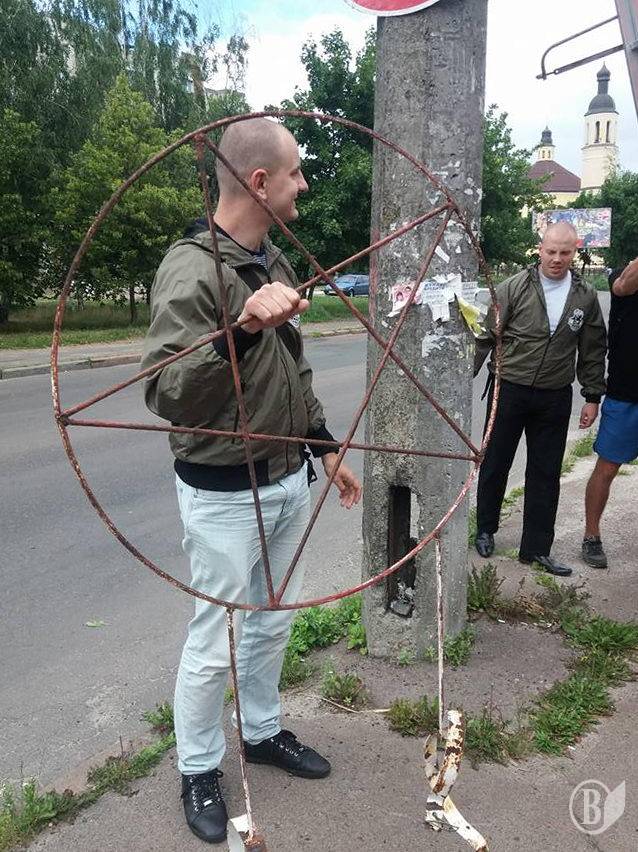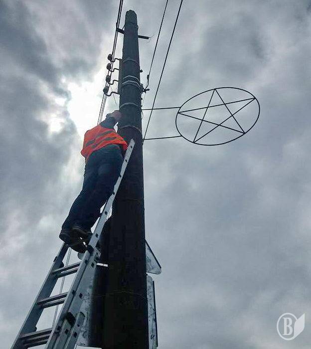 Це зварені з арматури та листового металу п’ятиконечні зірки та символ серпа й молота. Вони «прикрашали» стовпи щонайменше з першої половини 1980-х або й раніше.