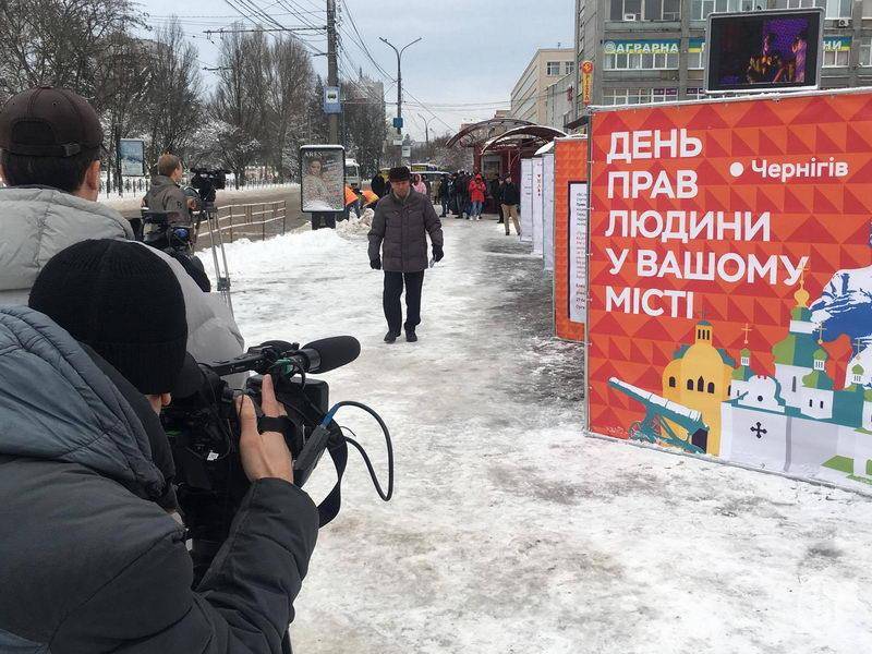 На площі перед ТЦ «Мегацентр» у понеділок 11 грудня було встановлено тематичну експозицію: шість кольорових конструкцій-кубів, проілюстрованих найважливішими даними з дослідження – графіками, цитатами, висновками та рекомендаціями. Регіональні особливості у відповідях респондентів представлені стосовно п’яти регіонів України – Заходу, Сходу, Півдня, Донбасу та Центру (зокрема, Чернігівської області). Також на площі організатори роздавали зацікавленим громадянам інформацію про опитування та діяльність правозахисних організацій, до яких можна звертатися за безкоштовною допомогою.