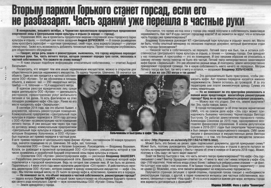 Одночасно стає зрозуміло, чому у серпні цього року керівник Горсаду Хольченков не пустив на підприємство перевірку на чолі з заступником Чернігівського міського голови Андрієм Черненко. Адже тоді нехитра схема по приватизації частини міського майна була б одразу виявлена.