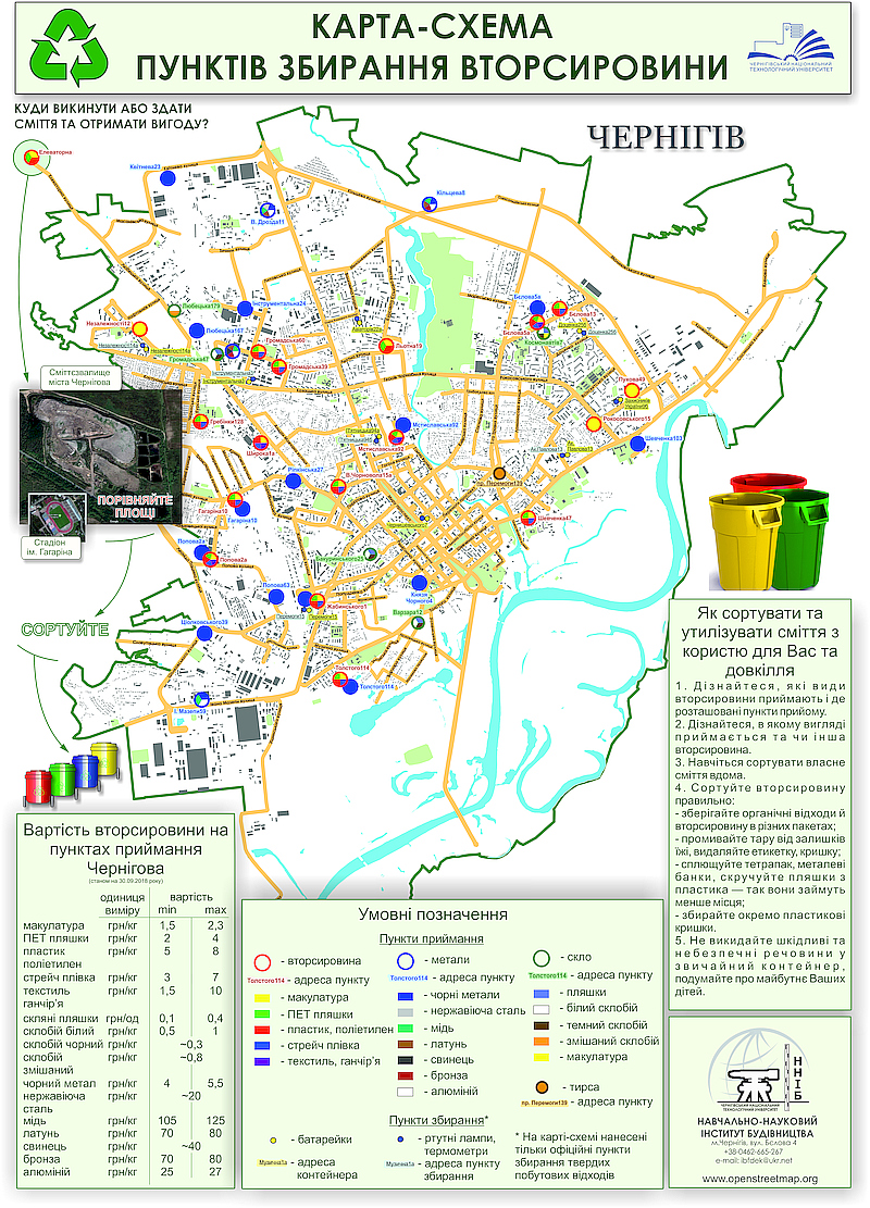 Щоби зорієнтувати містян, де такі пункти діють в Чернігові, управління ЖКГ міськради розробило спеціальну карту-схему. Тут же відмічені і пункти, де приймають відпрацьовані батарейки, ртутні лампи та термометри.