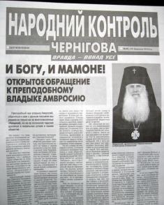 Пусть каждый, кто читает эти строки и возможно не соглашается с ними, простит нас, и Вы, отче Амвросий, простите нас, если что не так. Но просим вас мы лишь об одном: станьте по настоящему духовным лидером Чернигова и не идите на поводу у политиков и их даров, какими бы заманчивыми они ни были. Эти машины, участки, дома, деньги и прочие материальные прелести нашего мира – не что иное, как испытания и приводят лишь к томлению духа и утрате духовности. Не позволяйте никому втягивать церковь в политику и тем самым использовать верующих людей в угоду политиканам.