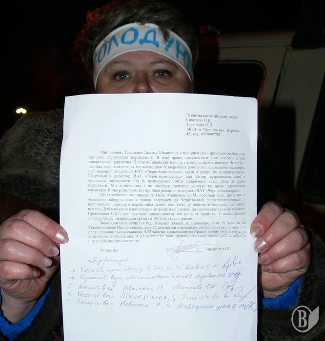22 жовтня приватний підприємець Олена Тараненко разом з чоловіком розпочали акцію протесту на центральній Красній площі Чернігова.