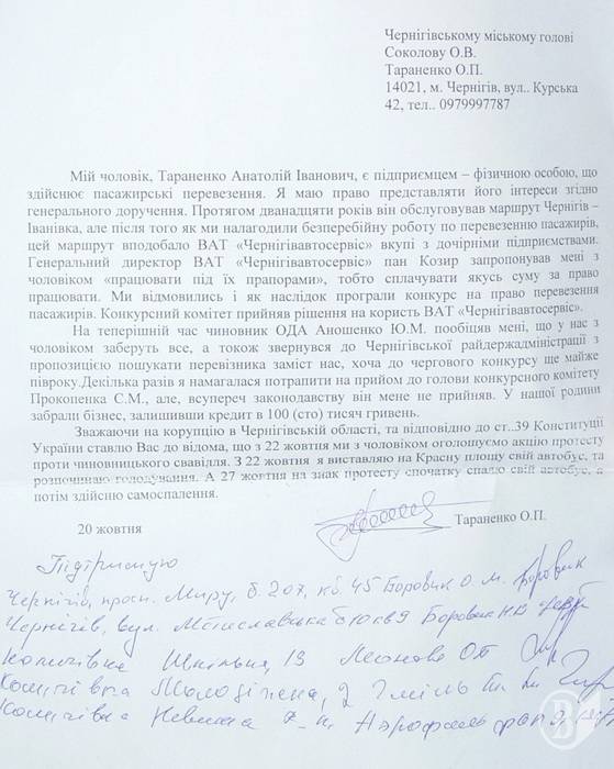 У своєму зверненні до міського голови Олександра Соколова жінка обіцяє 27 жовтня спалити свій автобус і здійснити акт самоспалення через позбавлення її чоловіка ліцензії на перевезення пасажирів за маршрутом «Чернігів-Іванівка».