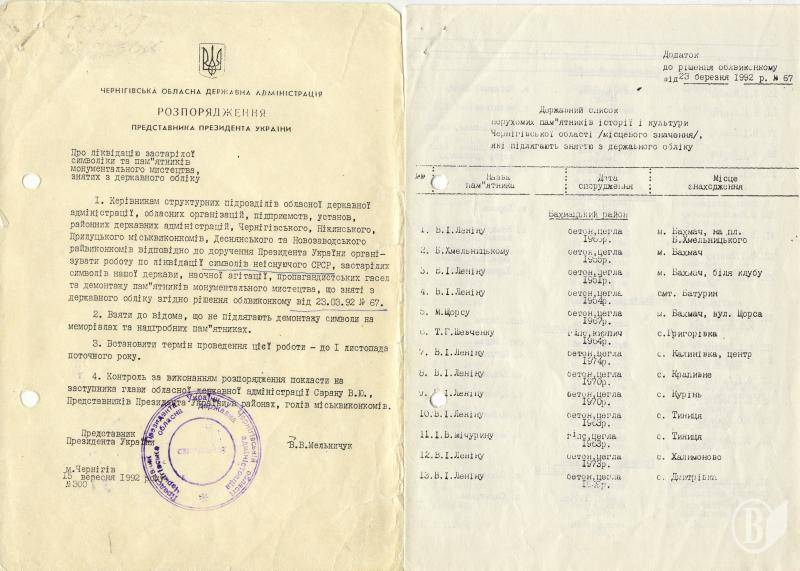 Авжеж! Нагадаю, що відповідно розпорядження Представника Президента України в Чернігівській області № 300 від 15 вересня 1992 року «керівникам структурних підрозділів обласної державної адміністрації, обласних організацій, підприємств, установ, районних державних адміністрацій, Чернігівського, Ніжинського, Прилуцького міськвиконкомів, Деснянського та Новозаводського райвиконкомів відповідно до доручення Президента України» було доручено до 1 листопада 1992 року «організувати роботу по ліквідації символів неіснуючого СРСР, застарілих символів нашої держави, наочної агітації, пропагандистських гасел та демонтажу пам’ятників монументального мистецтва, що зняті з державного обліку згідно рішення облвиконкому від 23.03.92р. №97».