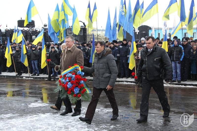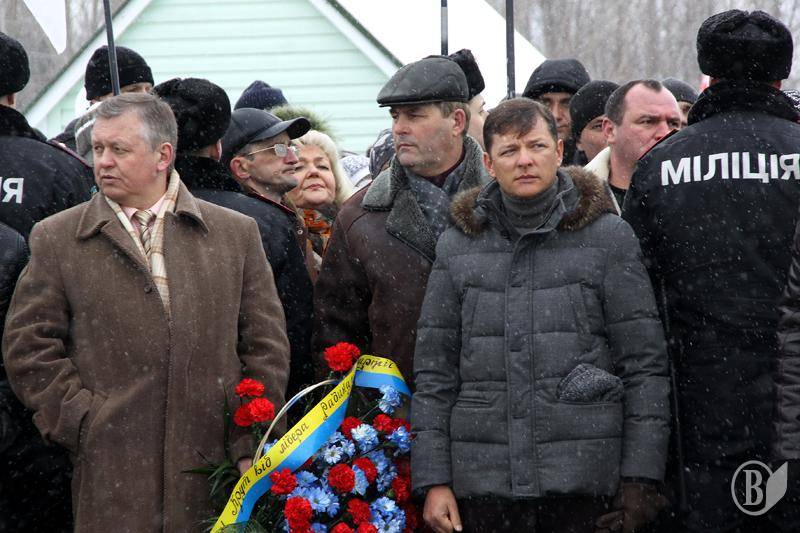 Між офіційним і опозиційним мітингом квіти до меморіалу покладає народний депутат Олег Ляшко з керівником Чернігівської обласної організації.